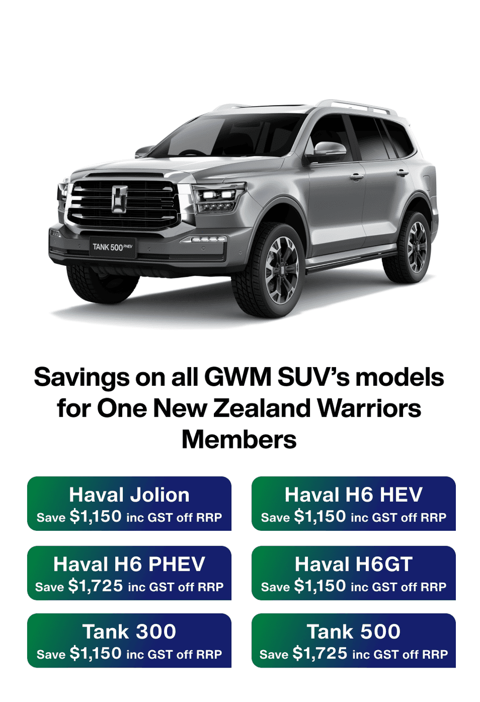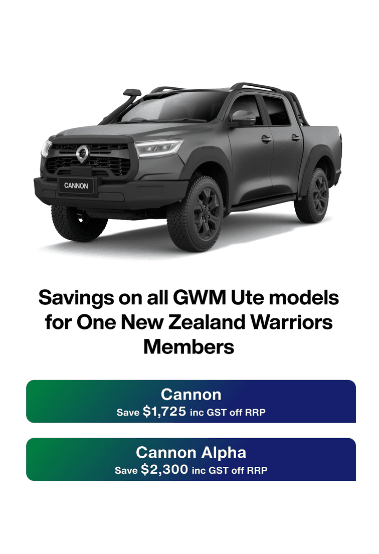 As a proud partner of the One New Zealand Warriors, GWM New Zealand offers Warriors members exclusive savings across the entire GWM range.